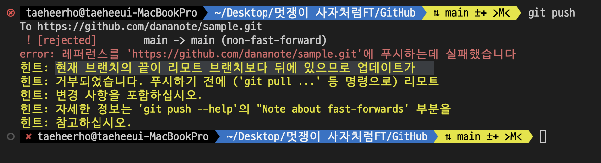어제 기초 Git / GitHub를 진행하다가 변경된 파일을 커밋하려고 git push를 했더니 "현재 브랜치의 끝이 리모트 브랜치보다 뒤에 있으므로 업데이트가 거부되었습니다" 오류가 떴다. 구글링 등으로 찾아보니 앞으로도 이런 오류가 잦을수도 있다는 글들을 많이 보게 됐고 후에도 찾아볼 수 있도록 기록을 남겨두려고 한다!