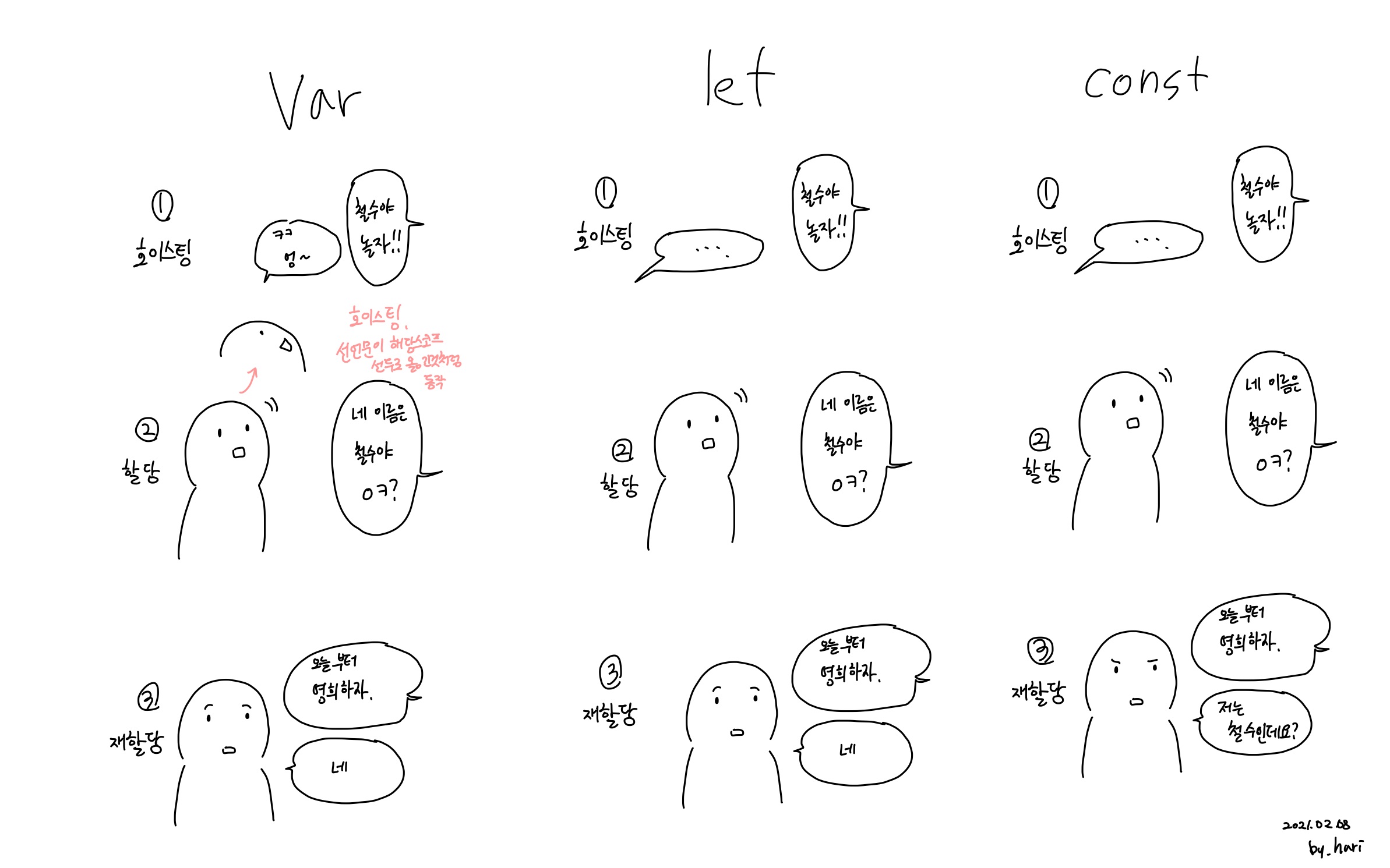 - var: ES5 이전, 지금은 사용 지양, 함수 레벨 스코프, 재선언시 에러X(에러가 안뜨기 때문에 협업개발시 문제 발생할 수 있음)