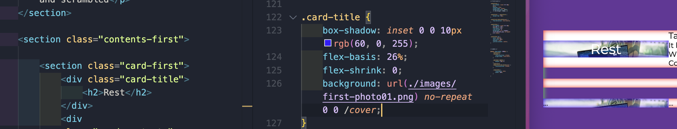 내가 제일 어려웠던 부분은 이미지를 넣고 그 이미지를 덮는 투명한 보라색 배경을 덮는 거였다. 그리고 그 높이는 카드의 height 만큼 꽉 채워지고 너비는 전체 wrapper 너비의 26% 비율을 유지하길 바랬다. 그러나 아래 이미지 처럼 딱 h2의 크기만큼만 높이를 차지했다.