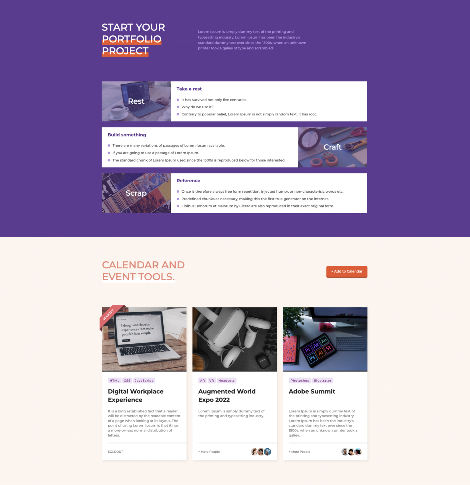 처음에 제일 큰 씬을 먼저 잡고 시작했다 시각적으로 제일 눈에 띄는 보라색 배경과 핑크 배경으로 class 명을 주었다.