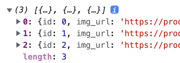 추후에 가지고 있는 데이터 개수 만큼 캐러셀이 작동해야하므로 객체형식으로 이미지 데이터를 생성했다. 그 안에는 '마켓컬리' 에서 가져온 배너 img-url와 이미지가 불러와지지 않았을 경우 불러옴 대체 텍스트, 이미지를 눌렀을 경우 넘어갈 src, key 값으로 전달할 id 가 들어있다.