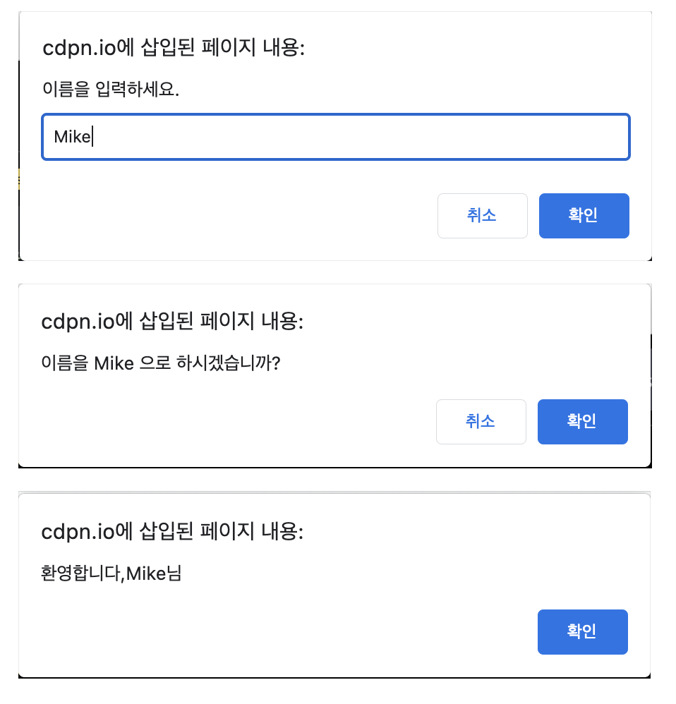 prompt 에서 사용자가 직접 입력한 name 값을 confirm을 통해 확인하고 마지막으로 alert을 통해 알려줌